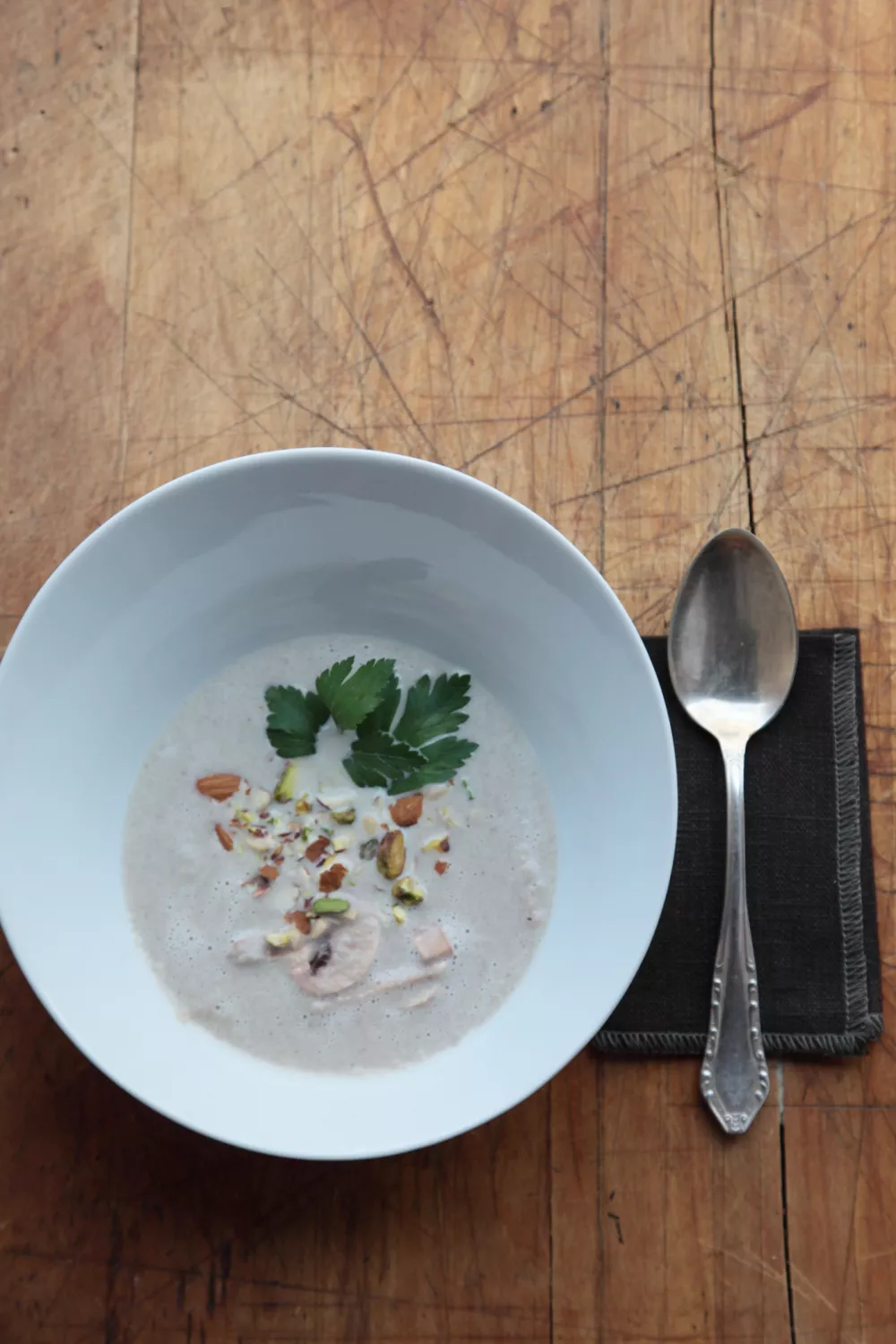 Deze romige champignonsoep is pure comfortfood voor herfst en winter. Ui en prei worden zacht gestoofd, champignons en aardappel sudderen in groentenbouillon met een vleugje citroen, daarna glad gemixt en afgerond met melk. Krokante pistache en hazelnoot zorgen voor een fijne bite. Ideaal als vegetarische eenpanssoep voor een doordeweekse lunch of een feestelijk voorgerecht.