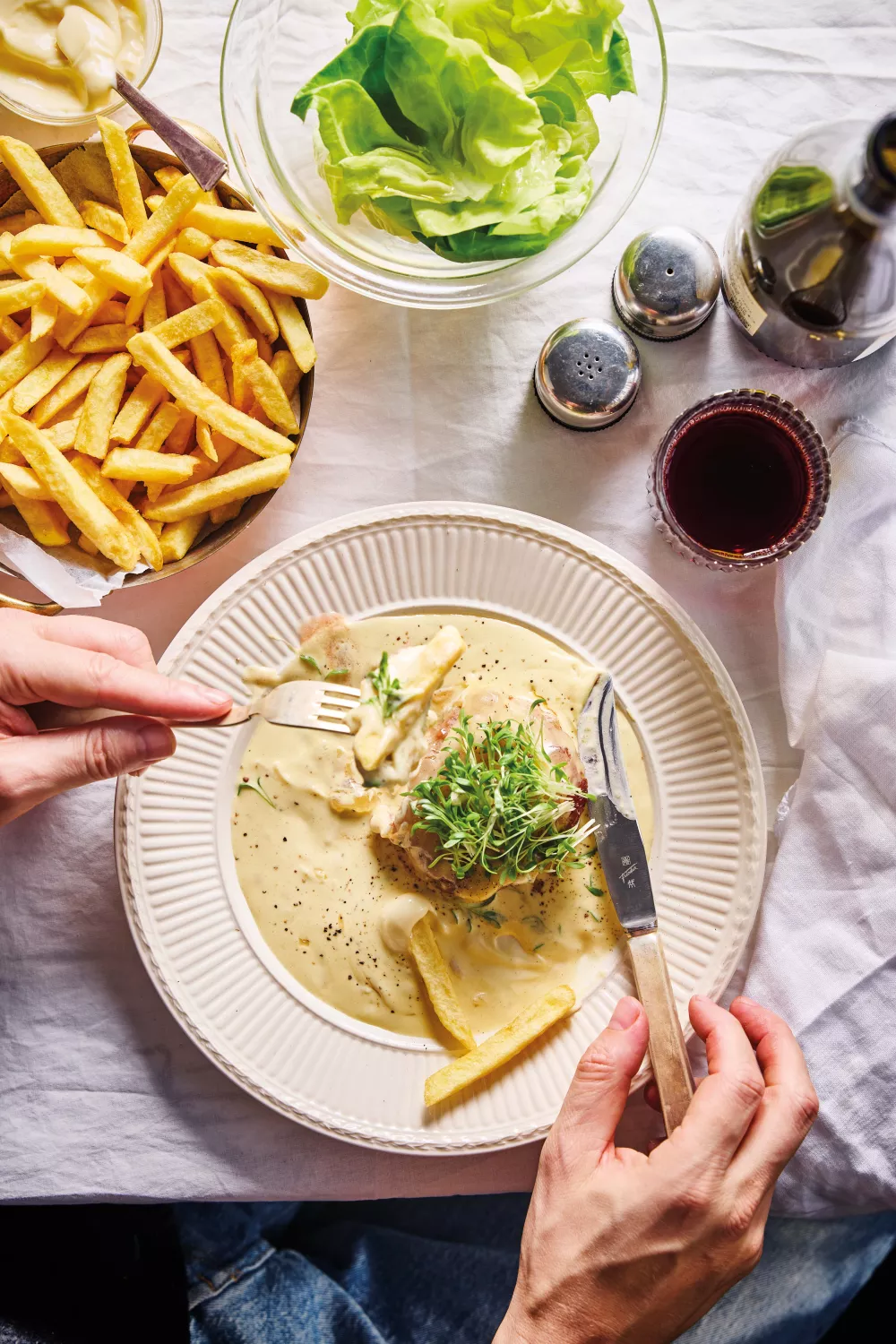 Serveer de burgers met frietjes, sla en cressonette, en lepel de mosterdsaus rond of over de burger.
