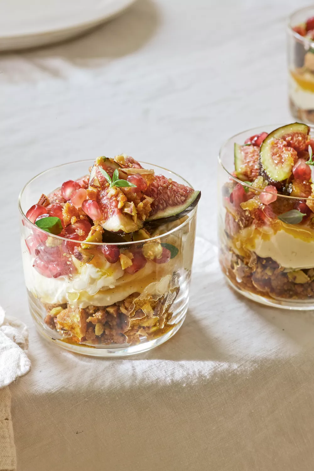 Schep vlak voor het serveren een royale hoeveelheid van de crumb in glazen (houd een klein beetje achter) en schep het fetamengsel, de vijgen, granaatappelpitten en tijmblaadjes erop. Lepel de honingsiroop erover – die druppelt vanzelf naar beneden over het fruit en de roomkaas – en eindig met een beetje van de opzij gehouden crumb.