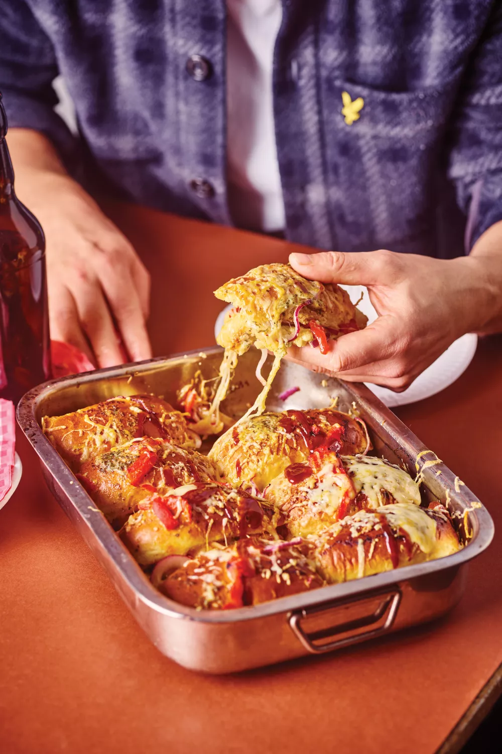 Bak de buns in het midden van de oven gedurende 10 à 12 minuten, tot de kaas goudbruin en gesmolten is en de broodjes lekker krokant zijn aan de buitenkant.