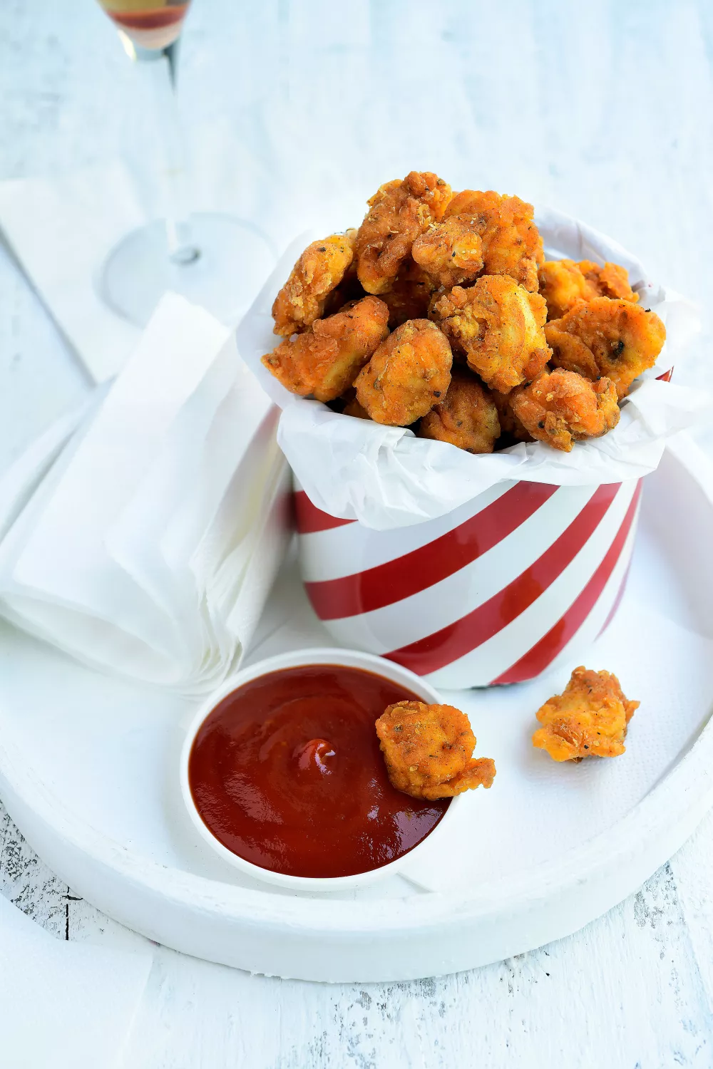 Laat de chicken pops uitlekken op keukenpapier en serveer ze met ketchup om in te dippen.