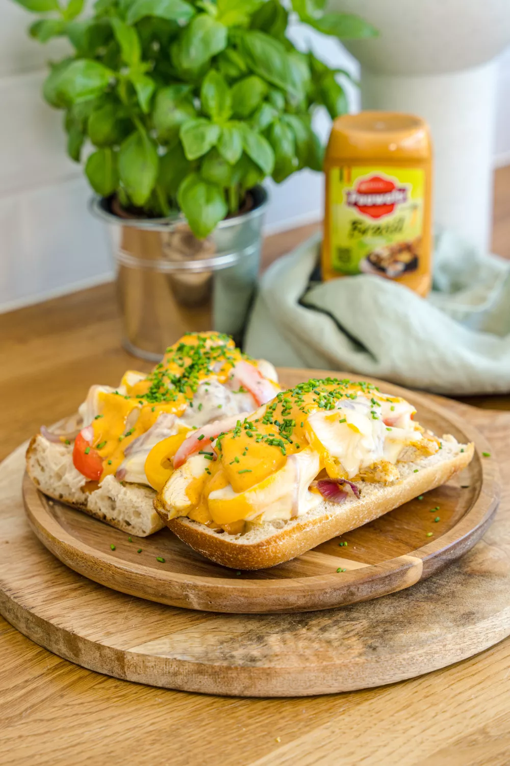 Smeuïge chicken sandwich op krokante ciabatta, gevuld met goudbruin gebakken kip gekruid met kipkruiden, kleurrijke paprika en zachte mozzarella. Perfect als snelle lunch of zomerse picknick, met Pauwels Brazilsaus en fijngehakte bieslook voor een pittig fris randje. De groenten worden kort aangebakken en alles gaat nog even onder de grill zodat de kaas smelt en de smaken samenkomen.