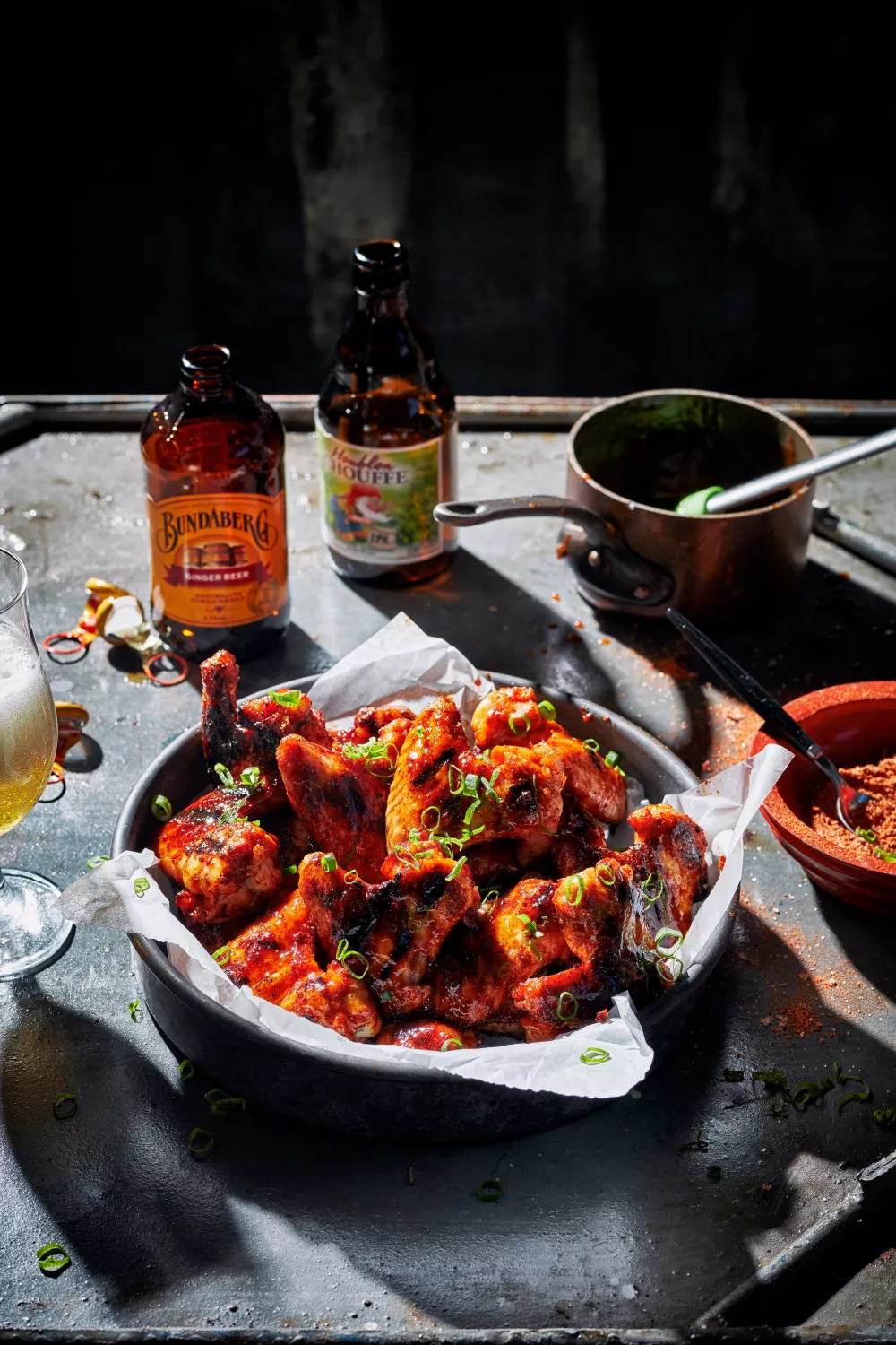 Deze malse chicken wings krijgen een rokerige, pittige smaak door een rub van rietsuiker, gemberpoeder, gerookte paprikapoeder en chilipoeder, afgewerkt met een zoet pittige gemberbierglazuur met sinaasappelmarmelade en chipotle. Door ze indirect te grillen op de barbecue en de gemberbiersaus in te koken ontstaan knapperige randjes en een plakkerige glans. Ideaal voor zomerse tuinfeesten, borrels of een gezellige game night.