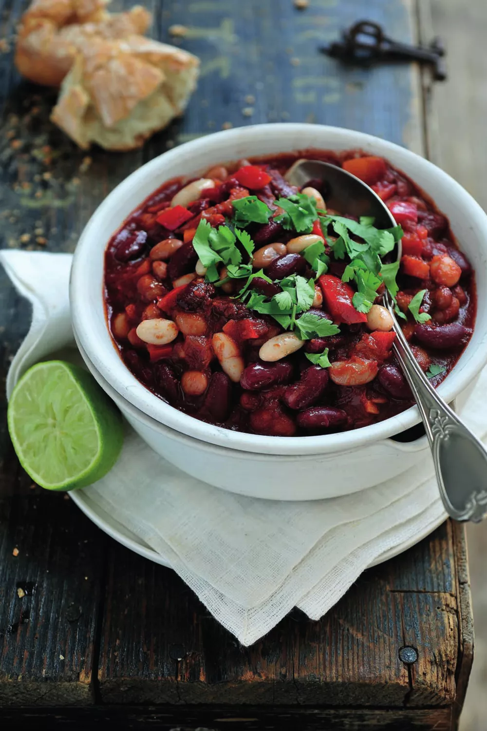 Deze stevige chili sin carne met drie soorten bonen combineert zachte cannellini, stevige borlotti en rode bonen met sappige tomaten, rode wijn en warme specerijen zoals komijn en een vleugje kaneel. Het gerecht wordt op laag vuur rustig gestoofd zodat de smaken zich verdiepen tot een troostrijk vegetarisch stoofgerecht, perfect voor herfstige diners of gezellige wintermaaltijden. Serveer met rijst of aardappelen voor extra comfort.