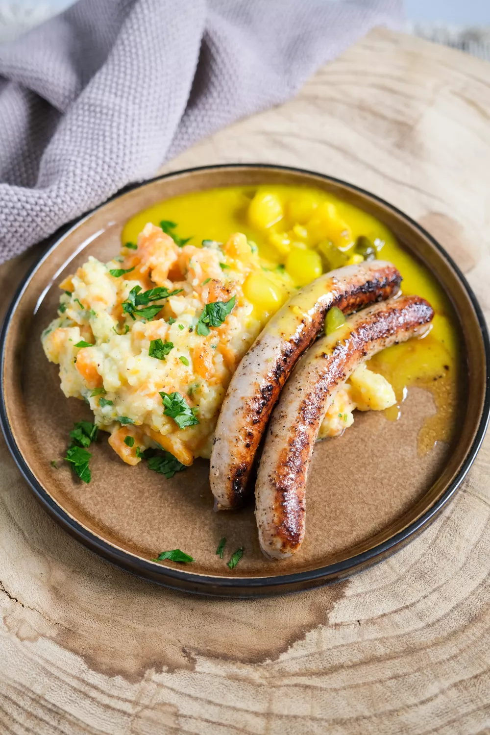 Chipolata met wortelstoemp en pickles