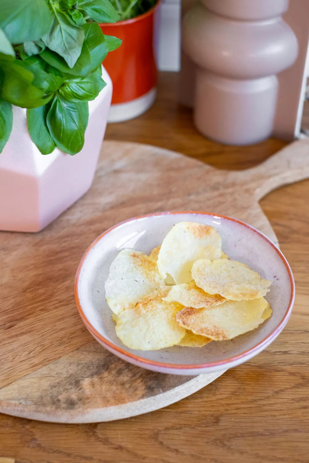Knapperige zelfgemaakte chips uit de microgolfoven, gemaakt van flinterdunne aardappelschijfjes met een snufje zout. Met een mandoline snijd je de dunne plakjes, spoel en dep je ze grondig en bak je ze op bakpapier in de microgolfoven tot ze krokant zijn. Draai ze halverwege om voor een gelijkmatige goudbruine krokantheid; ideaal als snelle borrelhap of gezonde snack bij een filmavond.