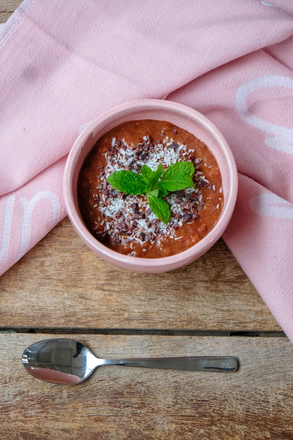 Schep het papje op een bordje of in een een kommetje. Top met kokosschaafsel en cacaonibs. Werk af met een blaadje verse munt.