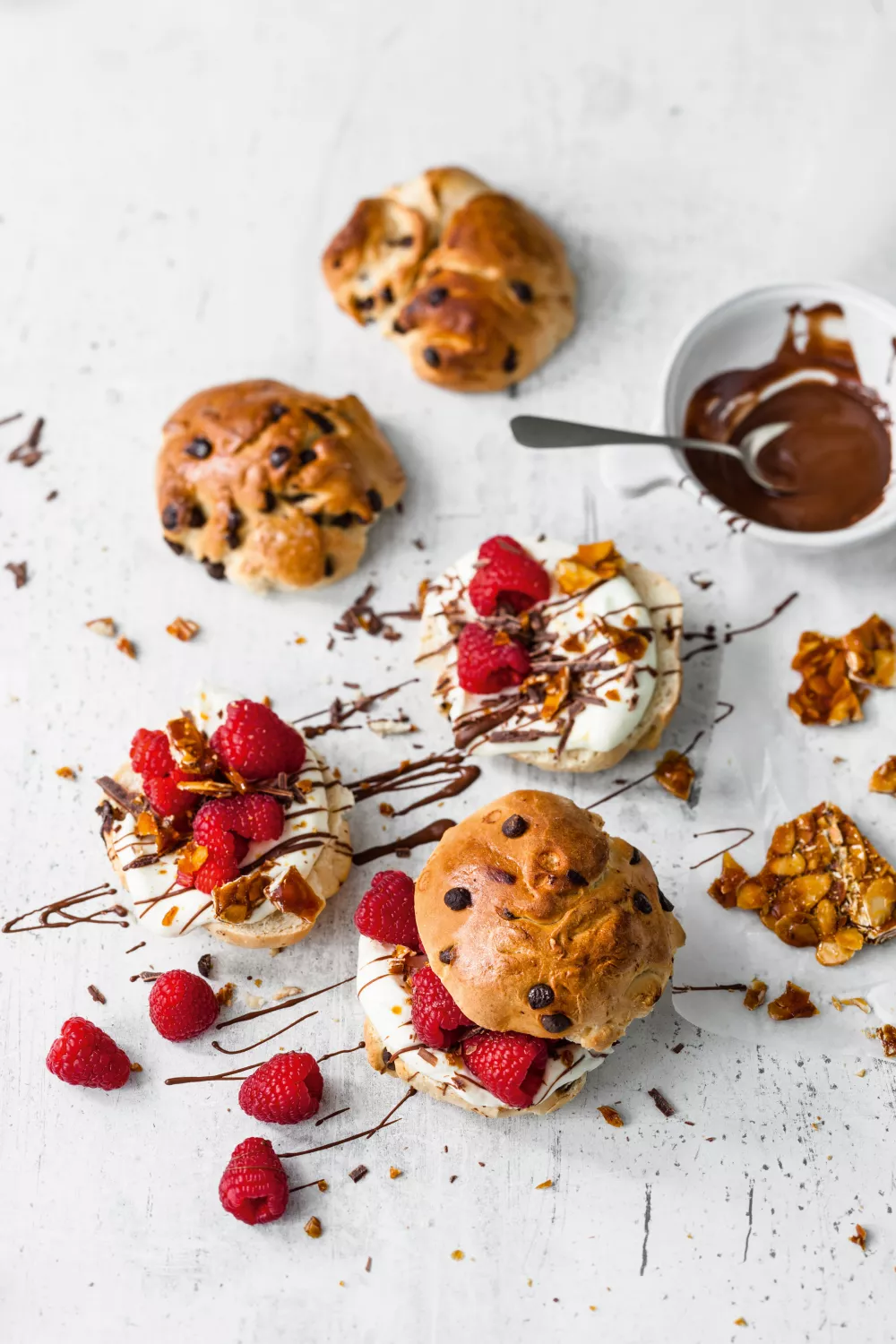 Luchtige chocoladebolletjes met knapperige chocoladedruppels, een romige vulling van witte chocolade en zure room en verse frambozen vormen een speelse dessertburger boordevol textuur en smaak. Het recept combineert klassiek brood bakken met au bain-marie smelten, slagroom kloppen en suiker karamelliseren voor krokante amandelen, ideaal als feestelijk dessert, brunchlekkernij of zomerse traktatie. Makkelijk deels voor te bereiden en samen te assembleren voor een gezellige tafel.