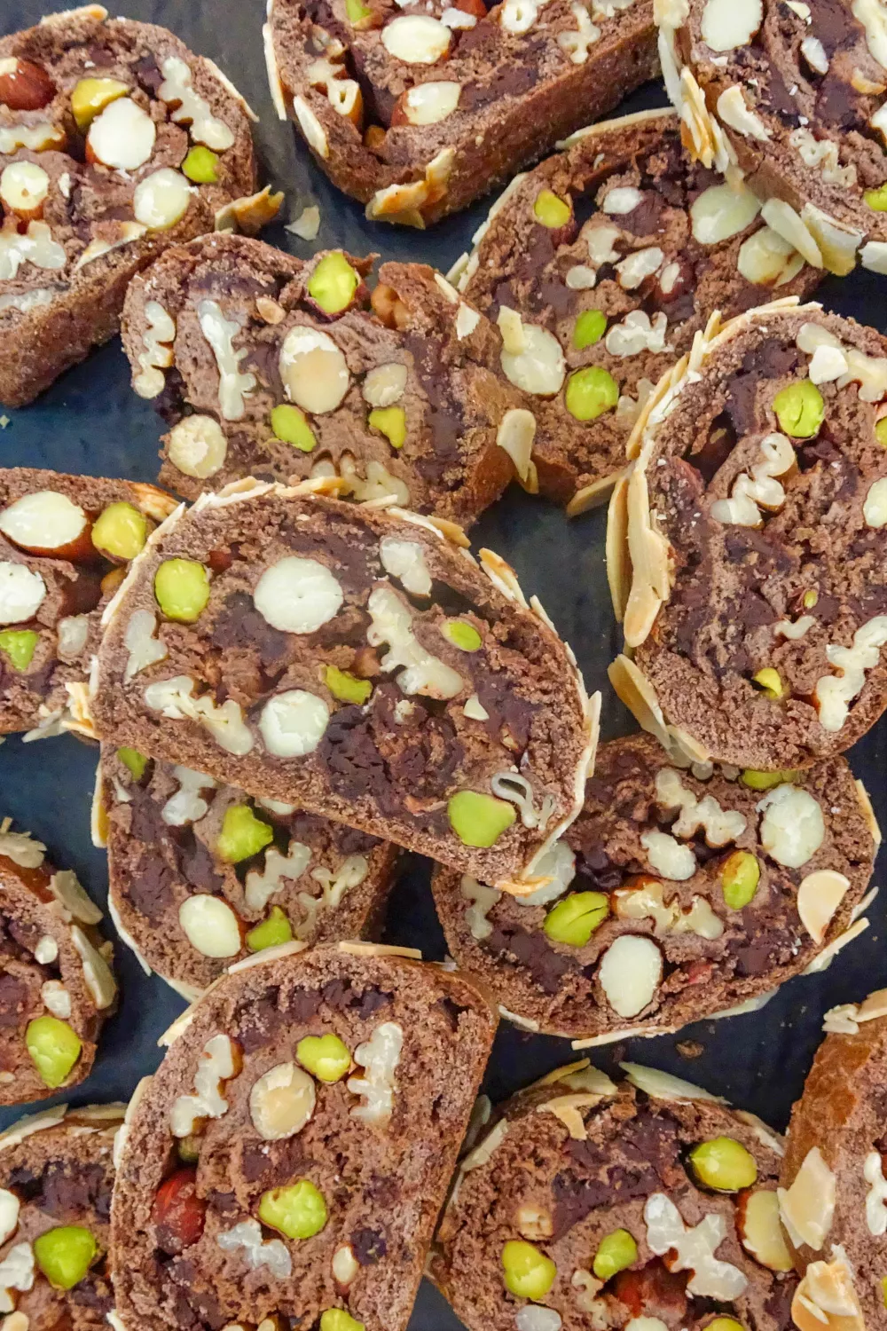 Strijk de bovenkanten in met eiwit en leg er afwisselend een rij amandelen, pecannoten, pistaches en chocolade drops op. Houd op het einde 2 cm over. Rol de stukken deeg op tot worsten, beginnend bij de zijde met noten. Druk het deeg goed aan zodat er geen luchtbellen in zitten. Plaats de rollen deeg één uur in de vriezer.
