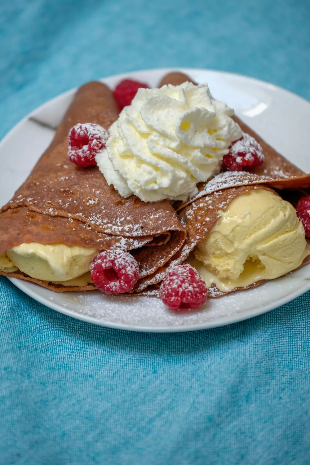 Leg een bolletje ijs bovenop de pannenkoek en vouw dicht tot een toetertje. Werk af met slagroom en verse frambozen.