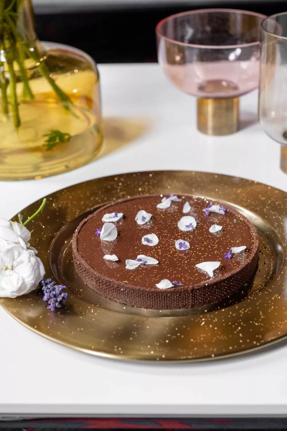 Haal de bodem uit de oven, laat een tiental minuutjes afkoelen en giet er vervolgens de ganache in. Laat het taartje een uurtje afkoelen en decoreer het (optioneel) alvorens te serveren.