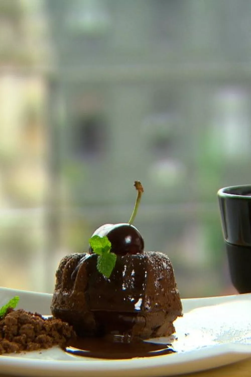 Serveer de brownie warm met chocoladesaus, munt en een kersje.