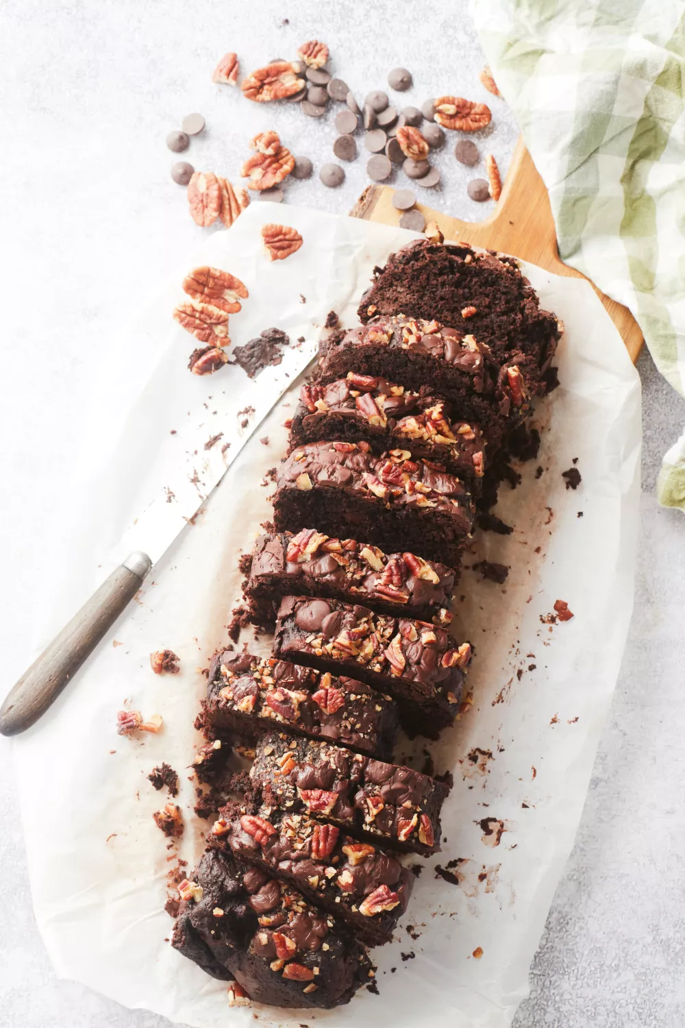 Deze smeuïge chocoladecake met courgette combineert rijke cacao met een subtiele groentesmaak en knapperige pecannoten, perfect als dessert of bij de koffie. Met plantaardige yoghurt, appelmoes en een lijnzaadei is hij volledig plantaardig en extra vochtig zonder boter, gemaakt met speltbloem en pure chocoladedruppels. Rasp en wring de courgette goed uit en meng droge en natte ingrediënten zachtjes om een luchtige, smeuïge structuur te bewaren, ideaal voor zomer of herfst.