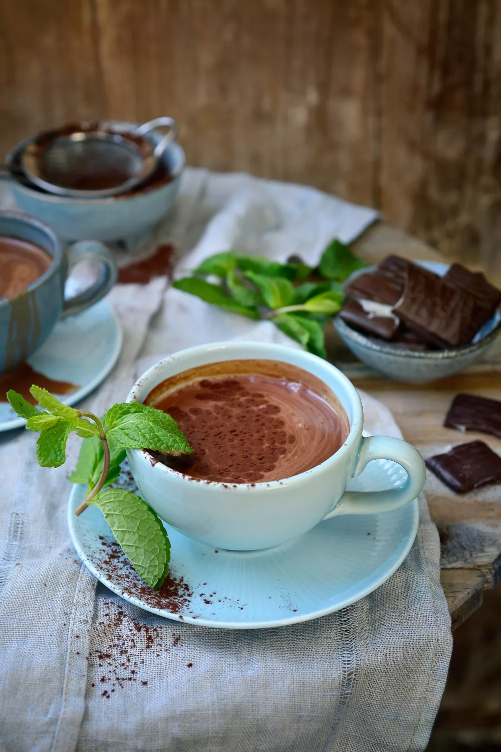 Giet de chocolademelk in een kop en werk naar eigen smaak af met verse slagroom, cacaopoeder en/of verse munt.