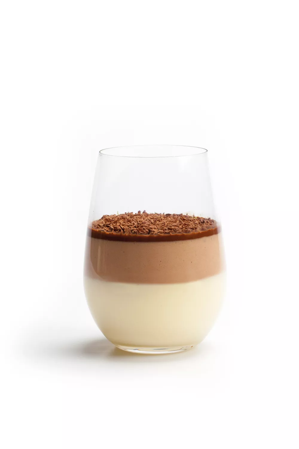 Romige chocolademousse met een luchtige bavarois van witte chocolade combineert zijdezachte witte chocola met een zachte melkchocolademousse en een rijke pure chocoladeganache. Met huisgemaakte crème anglaise, gekarameliseerde vanille en opgeklopte room is dit glaasjesdessert perfect voor feestelijke diners of een elegante traktatie. Werk af met fijn chocoladeschaafsel voor een verfijnde touch.