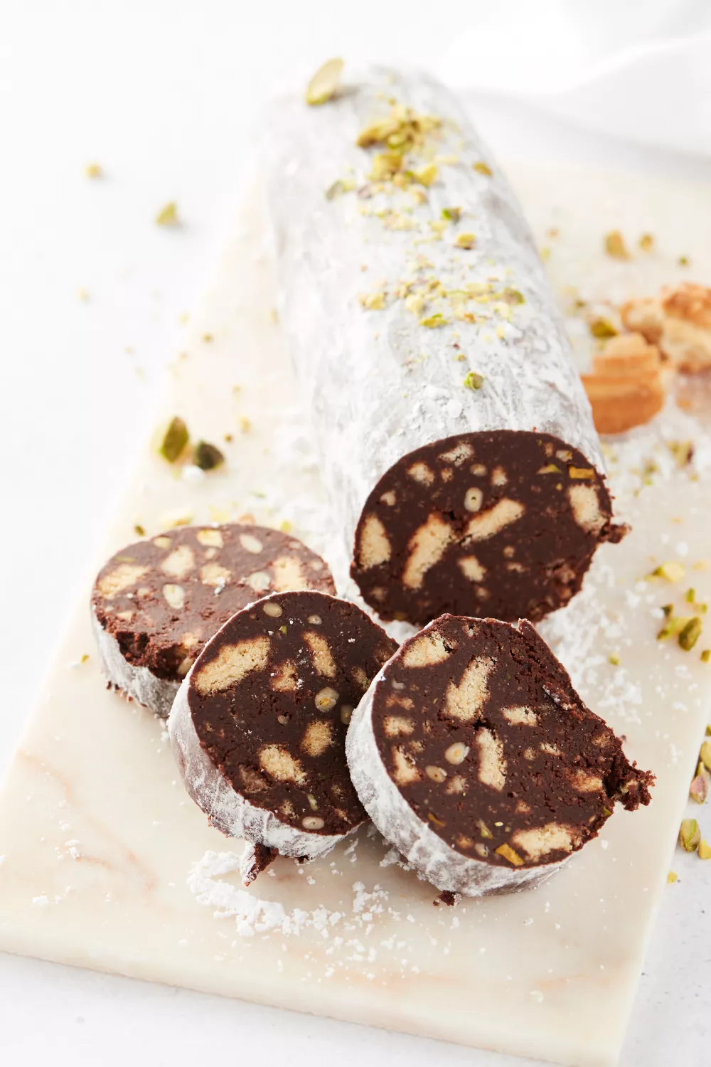 Rol de salame di ciocolatte in bloemsuiker en snijd in plakjes voor je hem serveert.