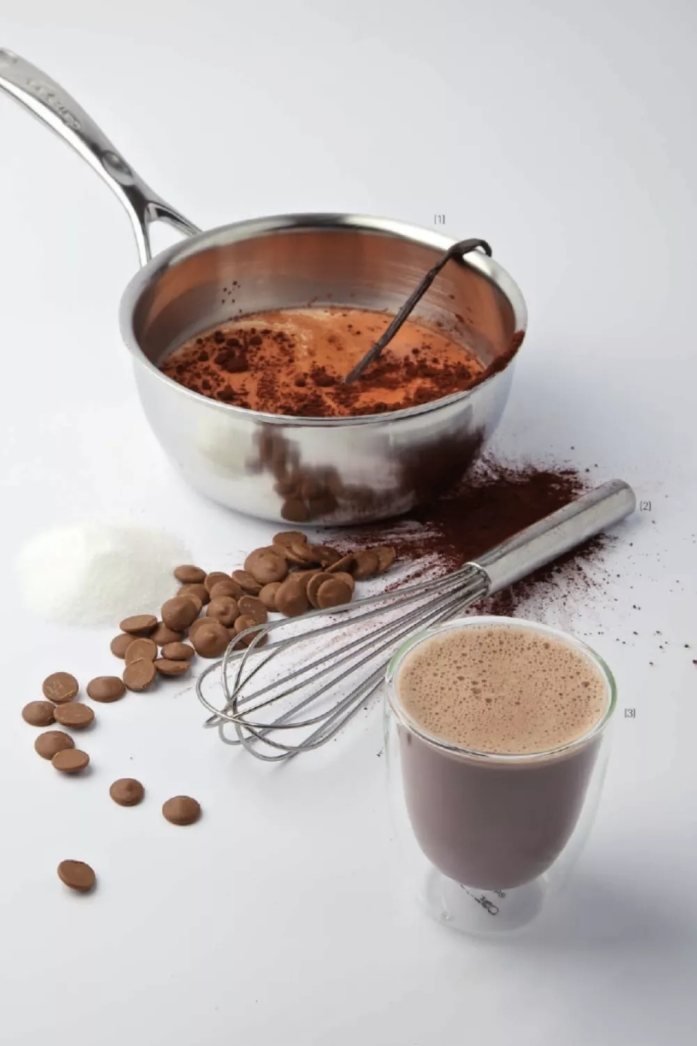 Kook de melk, samen met de room, het vanillestokje en de suiker. Giet de kokende vloeistof op de cacaopoeder en de chocolade. Roer goed door met een klopper en serveer.