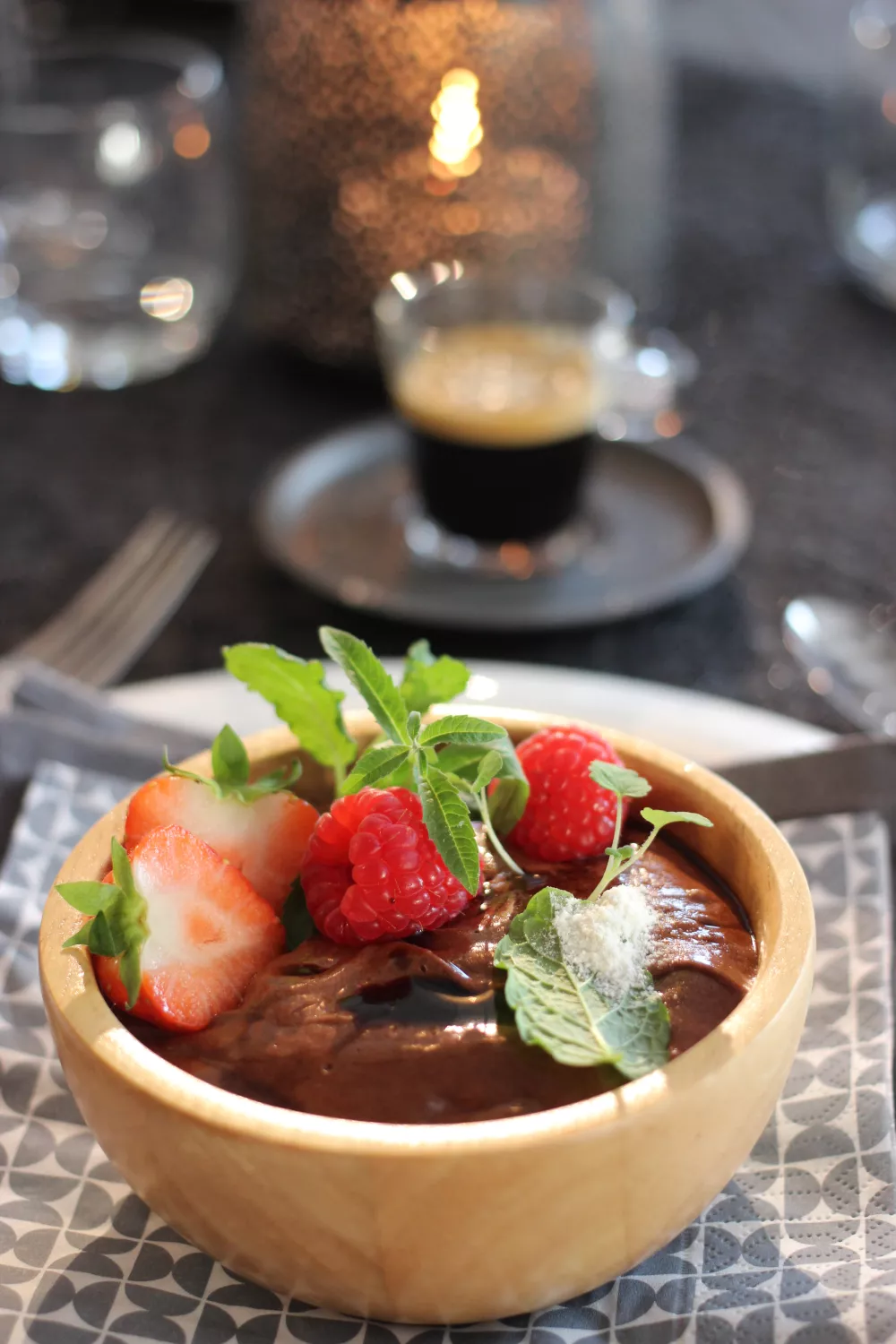 Serveer de chocomousse met de Nespresso Arpeggio Deca gezet als espresso.