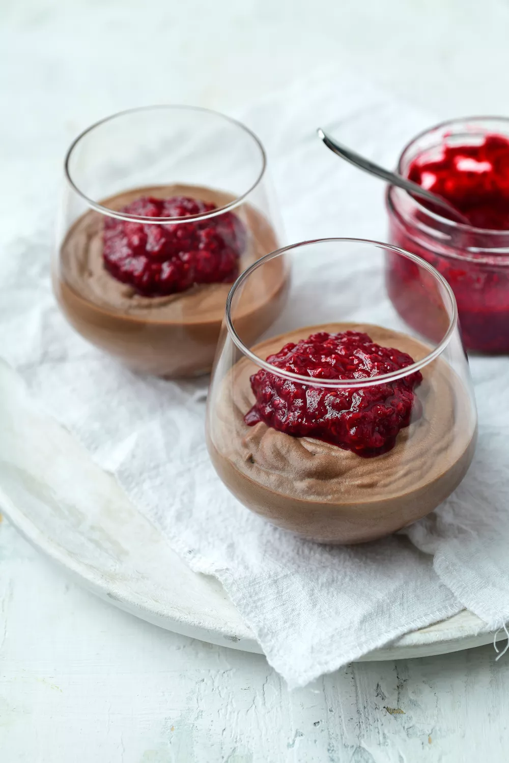 Schep net voor het serveren een lepeltje van de frambozencompote op de chocolademousse.