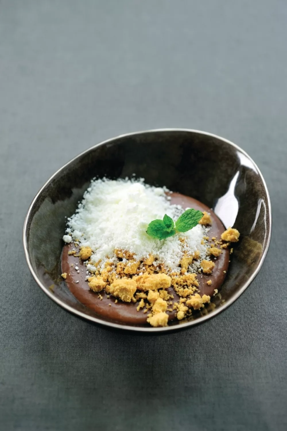 Zachte, luchtige chocomousse met een verrassende sneeuw van Griekse yoghurt brengt pure chocolade en frisse zuivel samen in een feestelijk dessert. De mousse krijgt zijn romige textuur door warm suikerwater met eierdooiers en opgeklopte room, waarna bevroren yoghurt in de blender tot poeder verandert en boterkoekjes voor een krokante bite zorgen. Ideaal voor een diner of zomerse avond wanneer je iets elegant maar niet te zwaar wilt serveren, afgewerkt met verse munt.
