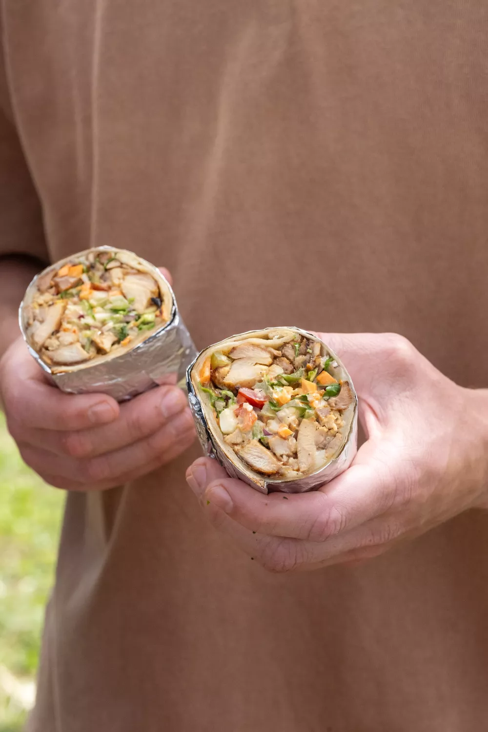 Verwarm de durumwraps kort op de plancha totdat ze soepel zijn. Beleg elke wrap met wat gemalen mozzarella, de gehakte kip, de gechopte groenten, een lepel samuraisaus en een lepel looksaus. Rol stevig op tot een durum, verpak eventueel in zilverpapier en snijd doormidden.