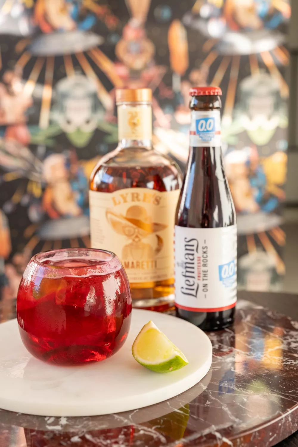 Vul het glas met ijs. Voeg Lyre’s Amaretti en cranberry sap toe. Top met Liefmans 0% en werk nog af met een partje limoen.