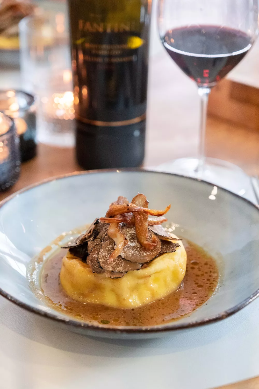 Kook de pastadonuts beetgaar in gezouten water. Schik in elk bord een donut en lepel er de ragout van bosduif rond. Werk af met geschaafde truffel.