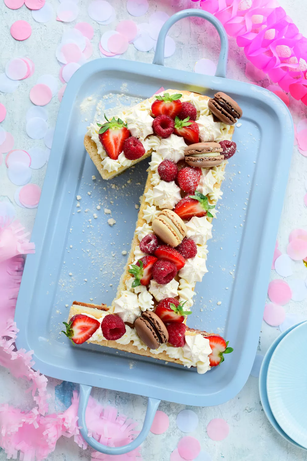 Vier feest met een luchtige cijfertaart van vanillebiscuit en romige botercrème, afgetopt met rodevruchtenconfituur, macarons, meringues en rood fruit. Deze feestelijke taart bestaat uit twee huisgemaakte biscuits die je uitsnijdt, besmeert en afwerkt met opgespoten toefjes botercrème. Perfect voor verjaardagen, babyshowers of zomerse taferelen en makkelijk te maken met basistechnieken zoals bakken, uitsnijden en spuiten.