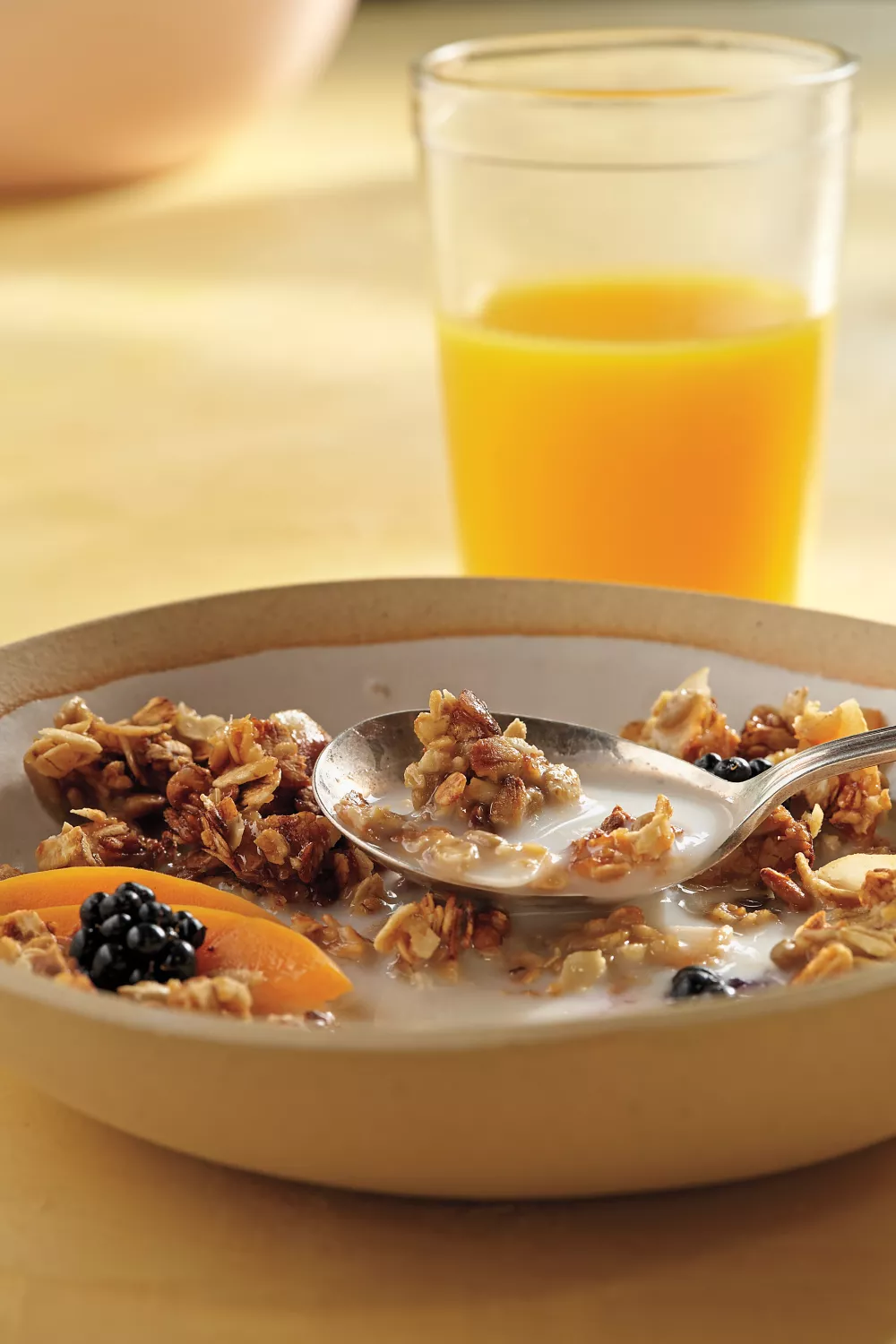 Spreid het mengsel uit over een bakplaat en bak het 20 minuten in de oven. Schep alles halverwege even om. De granola moet licht geroosterd zijn en voorkom dat hij te donker wordt, omdat hij anders bitter smaakt.