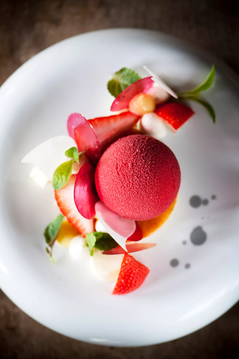Leg een schijfje citroencake op het bord. Leg daarop een bol vruchtenmousse, werk af met wat yoghurtcrème, stukjes aardbei, blaadjes citroenverbena, eventueel wat stevia en vers geraspte citroenschilletjes.