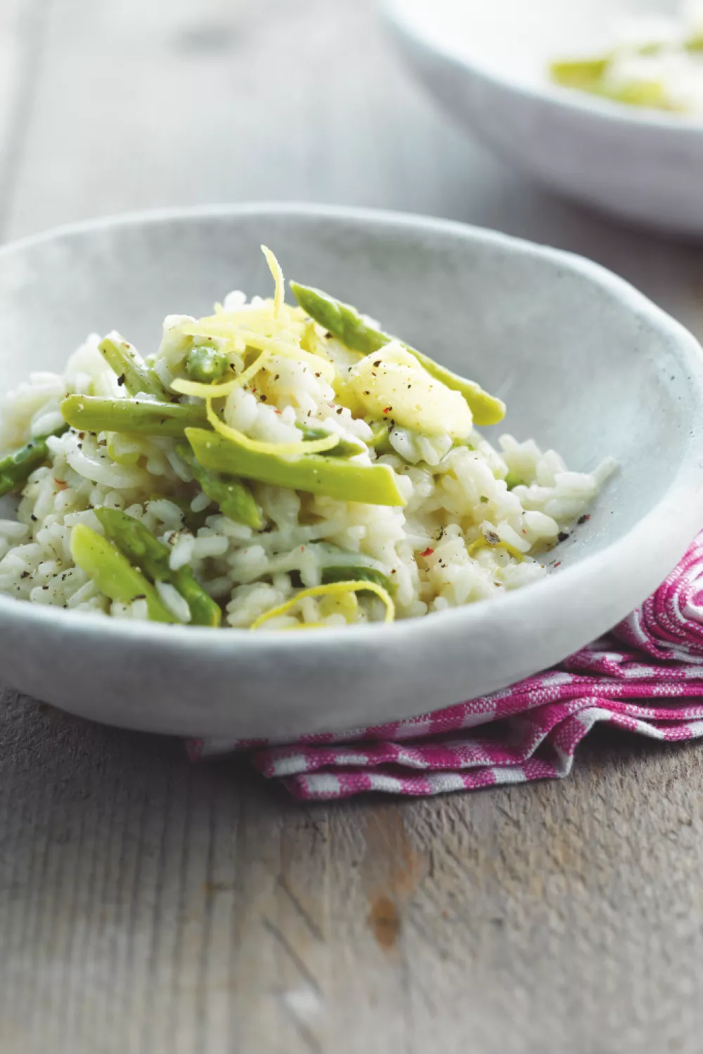 Na 10 minuten voeg je de asperges toe. Laat nog 10 minuten sudderen tot alle bouillon is geabsorbeerd en de rijst smeuïg en beetgaar is.