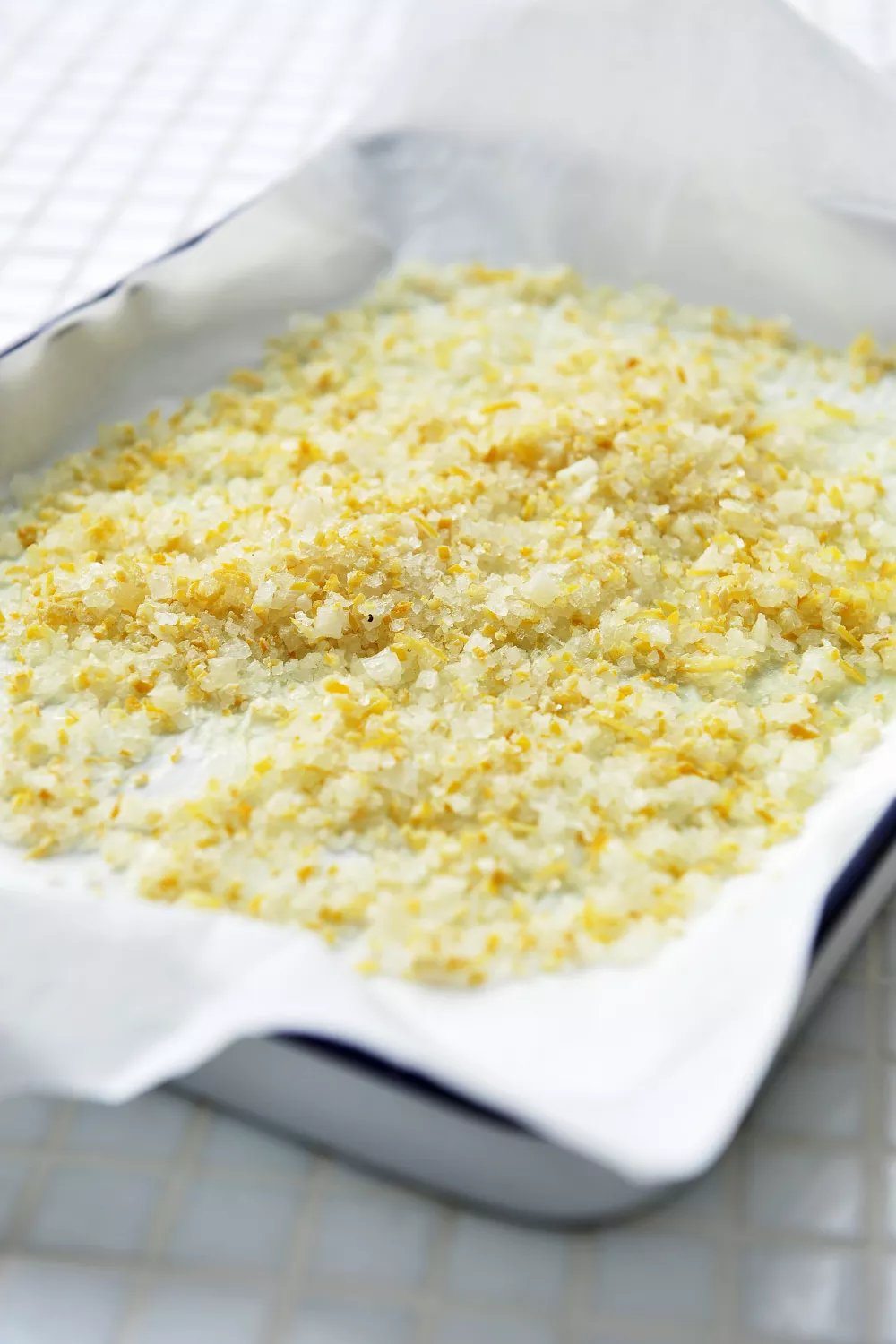 Meng de geraspte schil van de citroenen met het zeezout en verdeel het zout op een schaal belegd met bakpapier. Sprenkel het sap van de citroenen over het zout en laat alles op een goed verluchte plaats uitdrogen.