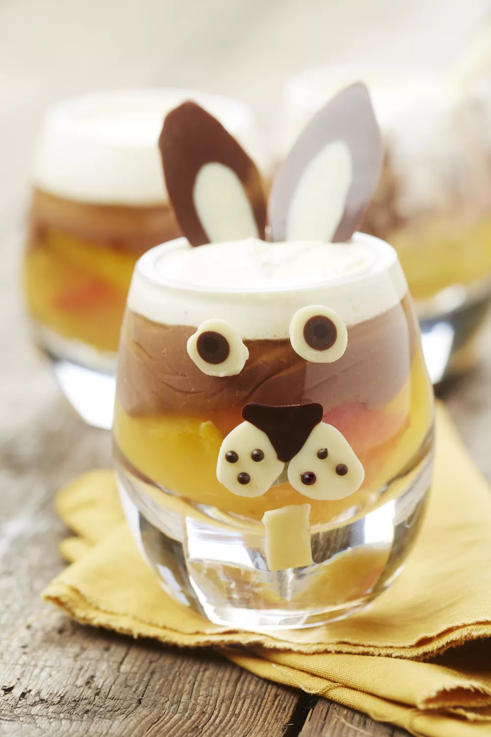 Dek met het afgekoelde mengsel het glas af. Eventueel kun je het glaasje garneren met paashaasaccessoires in chocolade.