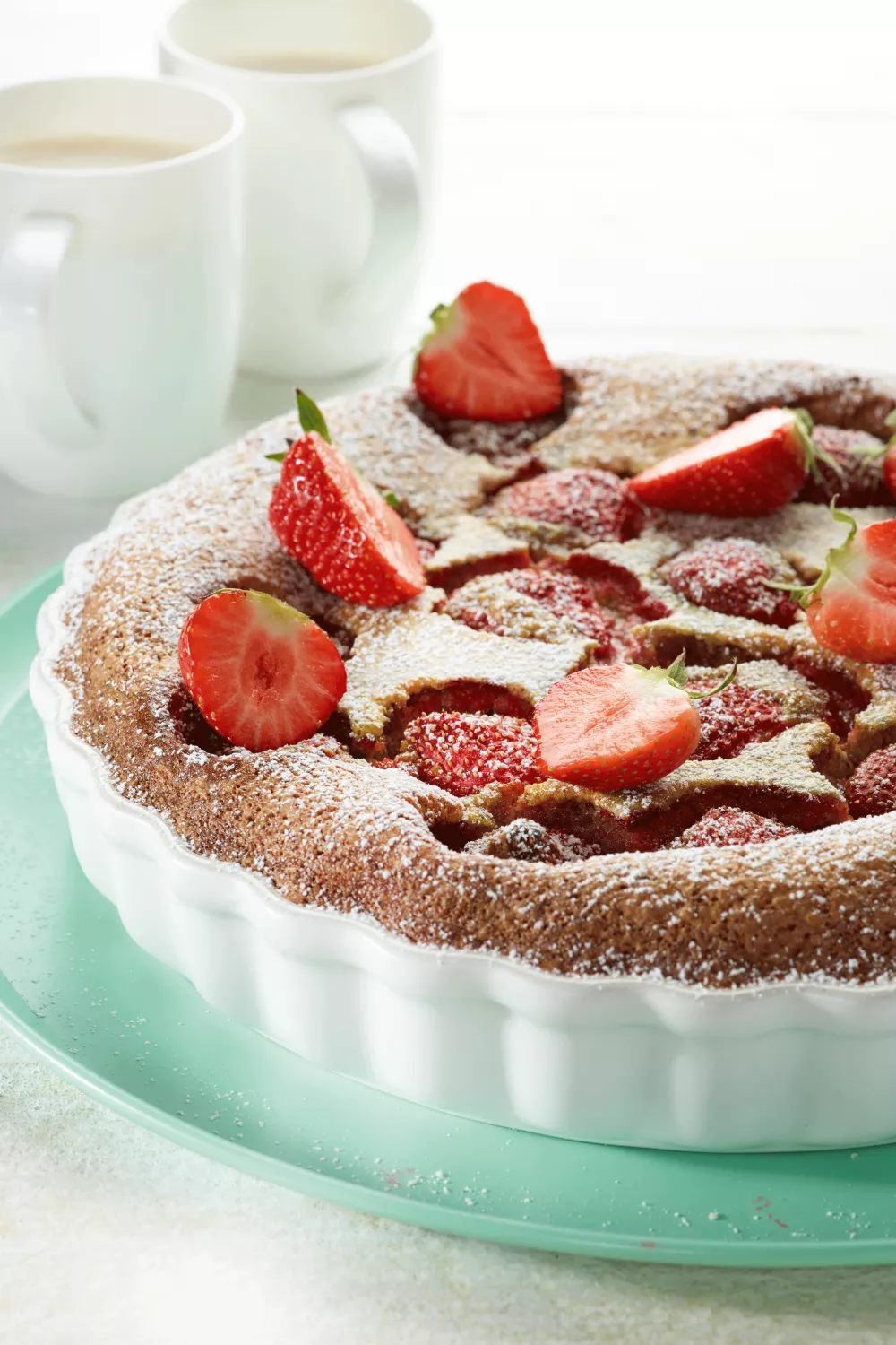 Bak de clafoutis gedurende ongeveer 25 minuten in de voorverwarmde oven. Garneer met bloemsuiker en verse aardbeien.