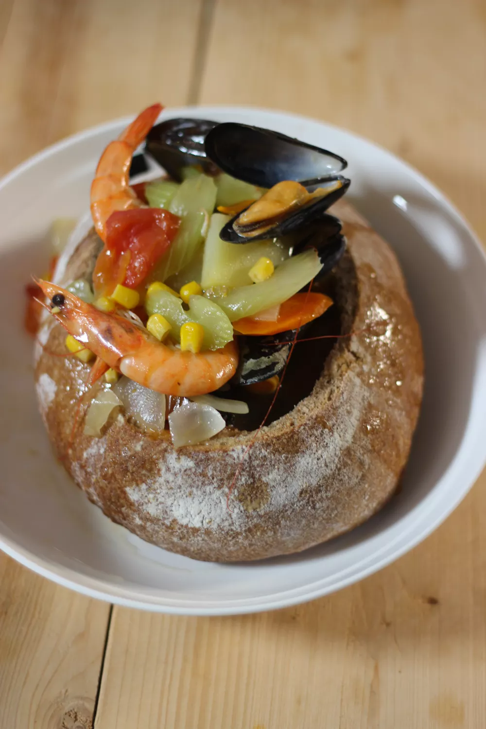Schep de soep uit in het uitgeholde brood en serveer onmiddellijk.