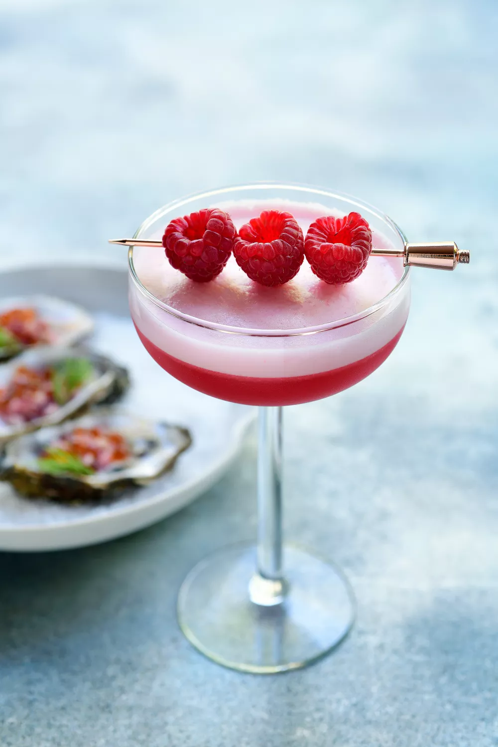 Zeef de cocktail in een voorgekoelde coupe en garneer met verse frambozen op een prikker.