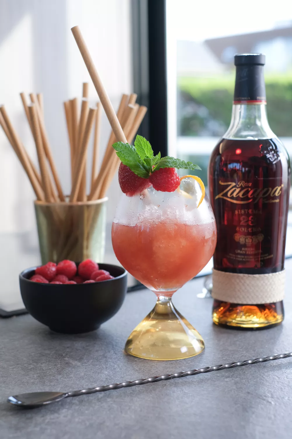 Deze kleurrijke cobbler cocktail combineert Zacapa 23 rum met rode vermout en hibiscussiroop voor een fruitige en licht bloemige smaak met frisse limoennoten. Door krachtig te shaken en te double strainen over crushed ice ontstaat een verfrissend aperitief dat perfect past bij zomeravonden en feestelijke borrels. Werk af met rood fruit, munt en een zeste van sinaasappel voor een elegante presentatie.