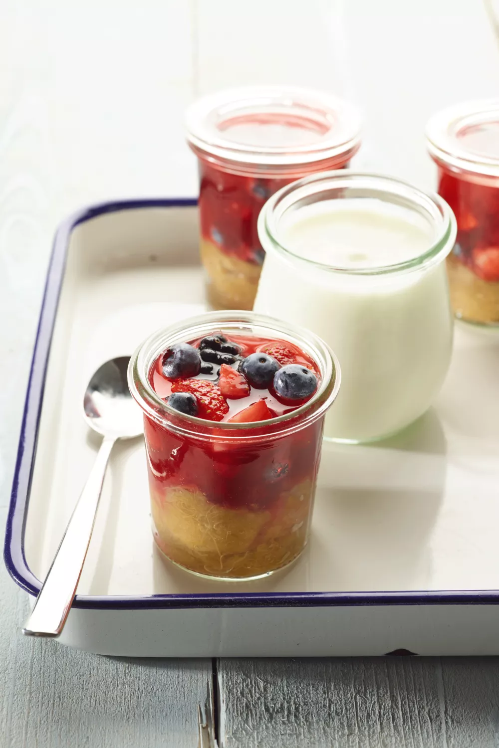 Laat de compote zo snel mogelijk afkoelen en giet over in glaasjes. Giet de aardbeiencoulis over de compote en werk af met wat gesneden aardbeien en blauwe bessen.