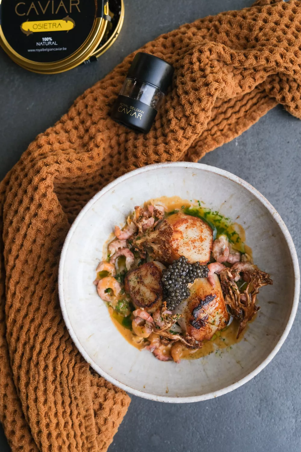 Dit elegante voorgerecht combineert zachte coquilles met romige bloemkoolcrème en een verfijnde garnalenjus, afgewerkt met krokante bloemkoolchips en een lepeltje kaviaar. De bereiding speelt met verschillende texturen en technieken, van dunne plakjes uit de oven tot een ingekookte jus van grijze garnalen en kort aangebraden schelpdieren. Perfect als luxe starter voor een feestelijk diner of een winterse avond.