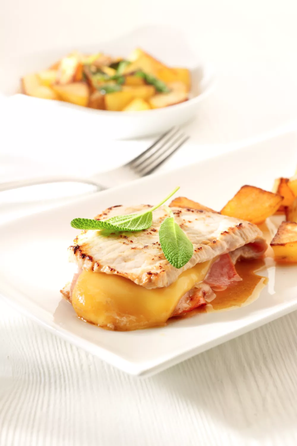 Een Italiaanse cordon bleu van malse kalfslapjes, gevuld met gegrilde ham en romige fontinakaas, geserveerd met ovengebakken aardappelen op smaak gebracht met tijm, oregano en knoflook. De lapjes worden kort door bloem gehaald en goudbruin gebakken, daarna afgewerkt met witte wijn en een aromatische bouillonsaus met verse salie. Perfect als hartig weekenddiner of gezellig herfst- of wintermaal voor familie en vrienden.