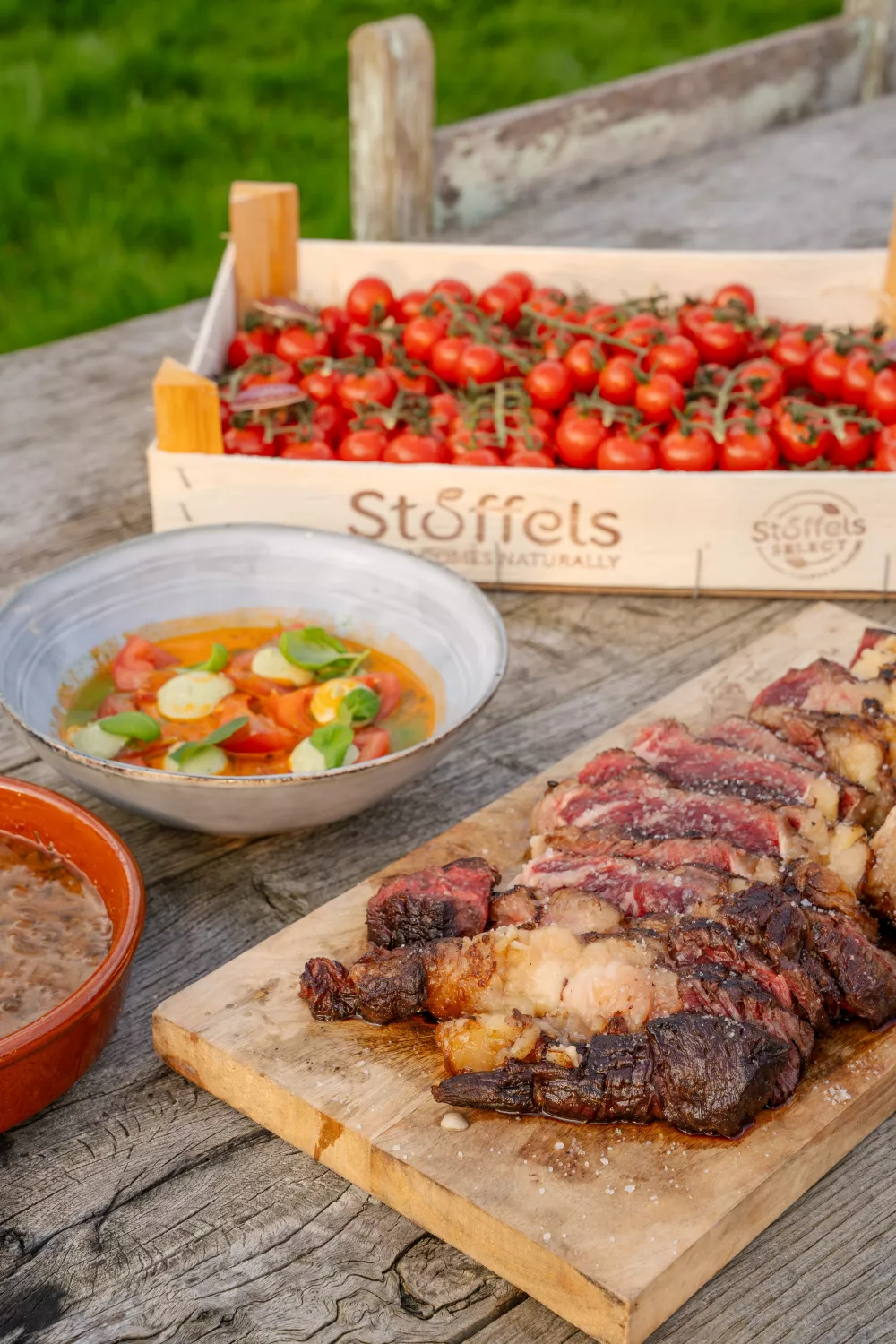 Côte à l’os met bordelaisesaus en tomatensalade is een luxueus hoofdgerecht boordevol smaak. Het sappige vlees krijgt een krokante korst op de barbecue en wordt geserveerd met een rijke bordelaisesaus, frisse tomatensalade en een verfijnde basilicummayonaise. De tomatenconsommé en basilicumolie geven extra diepgang en frisheid aan het gerecht. Perfect voor een elegant diner of een speciale gelegenheid.