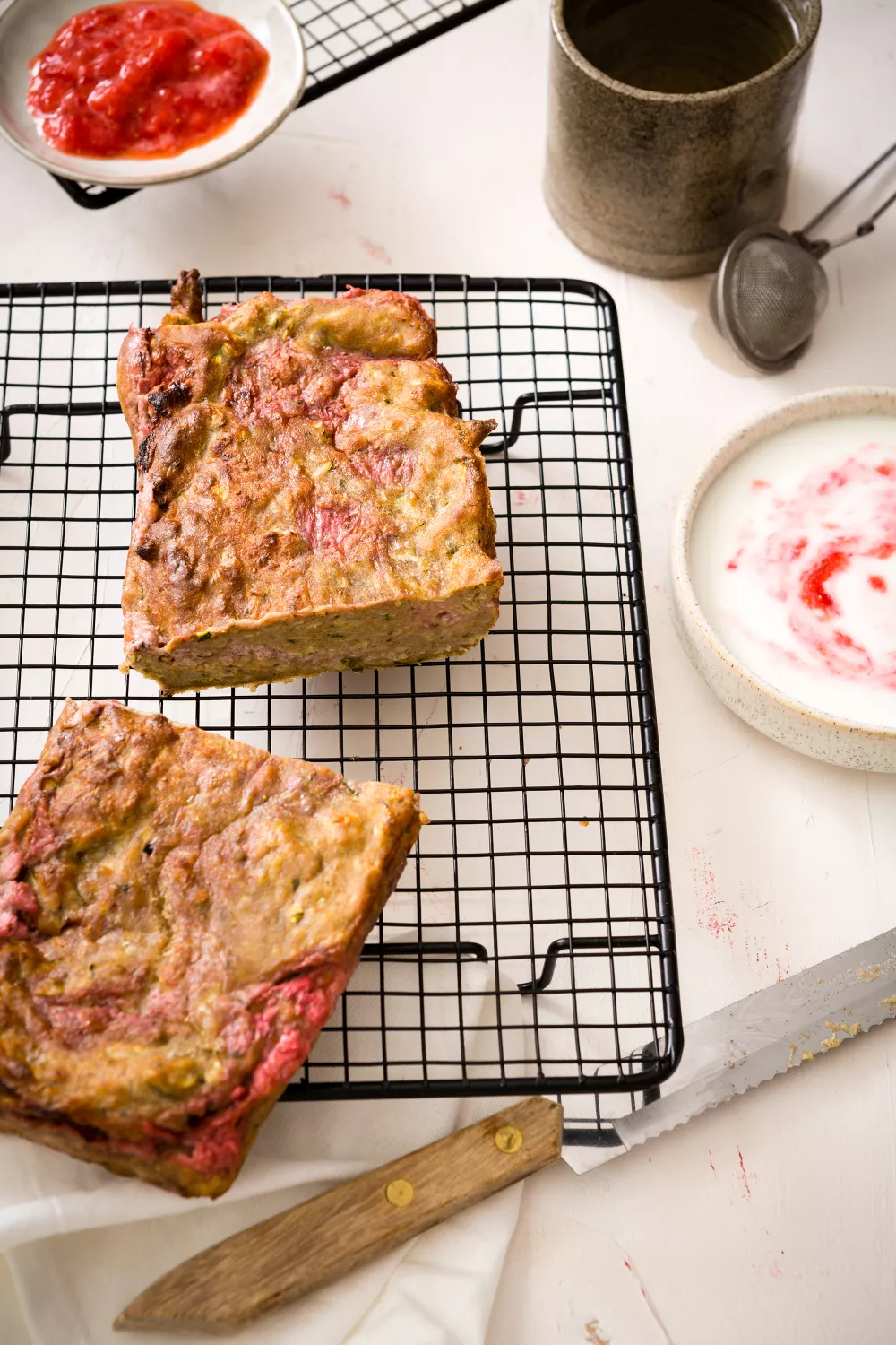 Vet een cakevorm in met wat kokosolie. Giet de helft van het courgettebeslag in de cakevorm. Giet nu de helft van de aardbei-yoghurtjam erop en duw het er wat in. Giet nu de rest van het courgettebeslag erop. Eindig met de andere helft van de aardbei-yoghurt jam on top.
