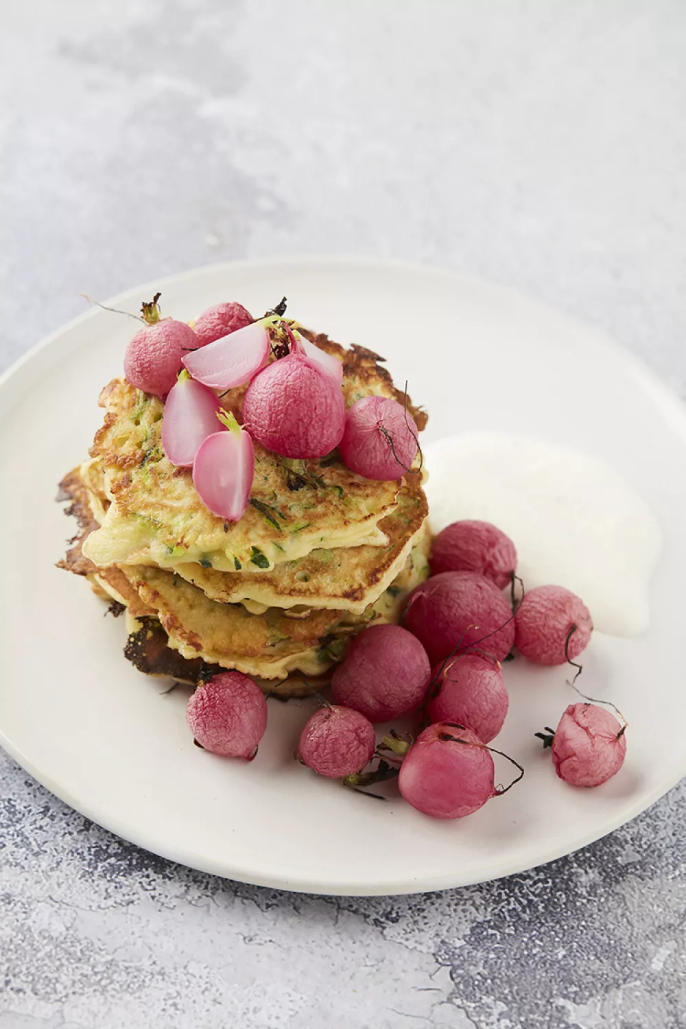 Stappenplan om recept “Courgettepannenkoekjes met geroosterde radijzen” te bereiden