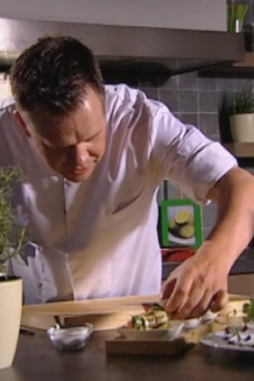 Snijd de courgette met de mandoline in plakjes en grill ze in de pan met een scheutje olijfolie.