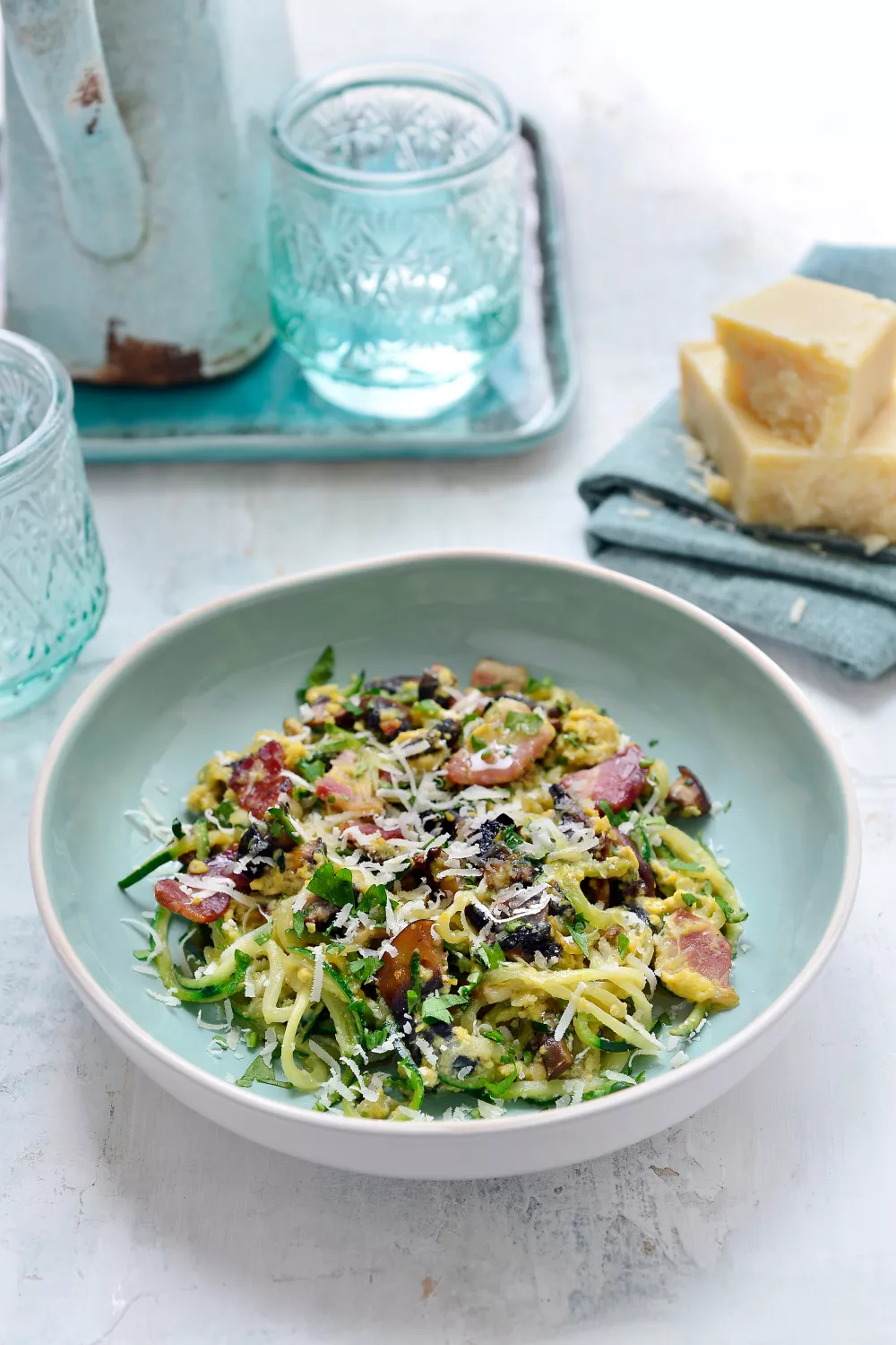 Lichte courgetti carbonara met courgettesliertjes, gebakken champignons en krokant gerookt spek is een snel en smaakvol alternatief voor klassieke pasta. Met een romige saus van ei en Parmezaanse kaas die je van het vuur af door de warme courgetti mengt maak je in enkele minuten een doordeweekse lunch of zomers diner. Gebruik een spiraalsnijder voor mooie slierten en werk af met extra Parmezaanse kaas en versgemalen peper.