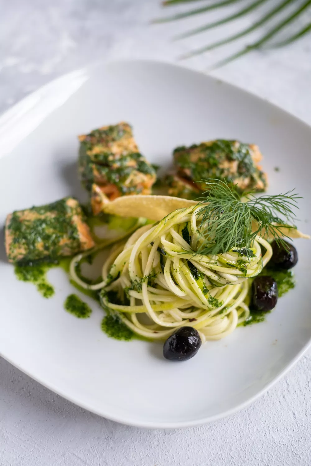 Lichte courgetti met zalm in een knapperige kruidenkorst die fris en hartig tegelijk is, met citroen, olijfolie, zwarte olijven en een vleugje mosterd. Maak sliertjes van courgette, bestrijk de zalm met mosterd en rol ze door fijngehakte basilicum, dille, peterselie en bieslook voordat je ze kort bakt. Ideaal als gezonde zomerse lunch of verfijnd voorgerecht bij een mediterraan diner, afgewerkt met krokante papadum voor extra textuur.