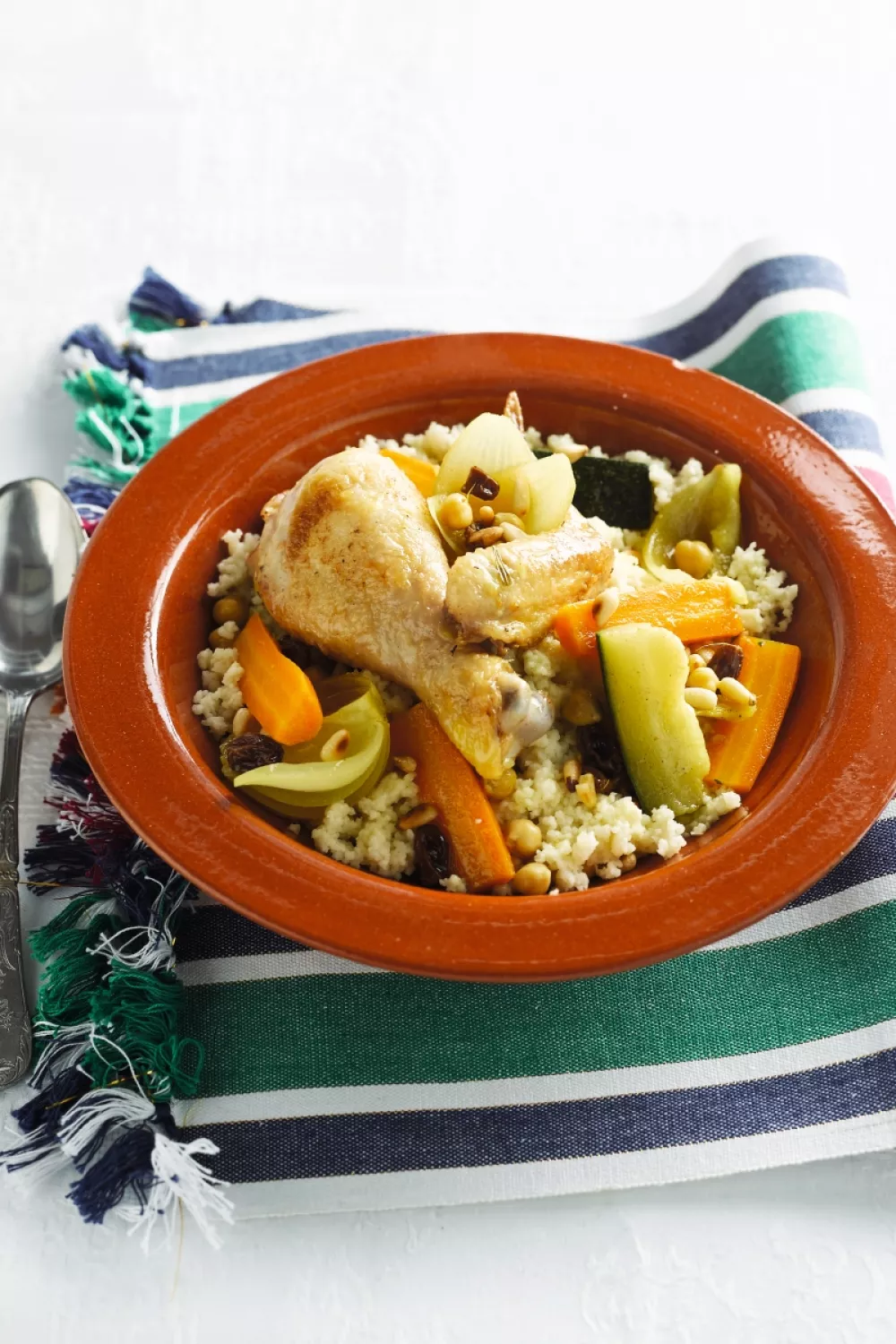 Deze rijke Marokkaans‑geïnspireerde couscous met kip en kleurrijke groenten combineert saffraan, kurkuma en geraspte gember voor een warme, aromatische smaak. De couscous wordt zacht gestoomd terwijl kip en groenten langzaam sudderen met pompoen, kikkererwten en gedroogd fruit. Perfect als feestelijk familiegerecht voor herfst- en winteravonden.