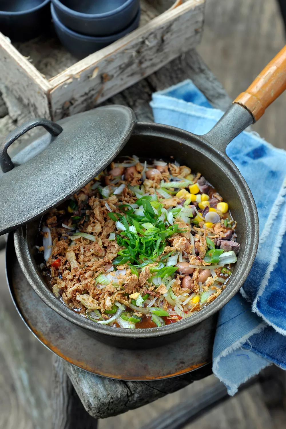 Deze stevige cowboysoep mix van corned beef en rundsgehakt met bruine bonen, maïs, tomaat en een scheutje bruin bier geeft een hartige, licht kruidige smaak die uitnodigt op koude avonden of bij een informele maaltijd. De soep suddert rustig met taco en cajunkruiden zodat de smaken goed intrekken. Serveer met een lepel zure room, geraspte cheddar, lente-ui en krokante uitjes voor romigheid en crunch.