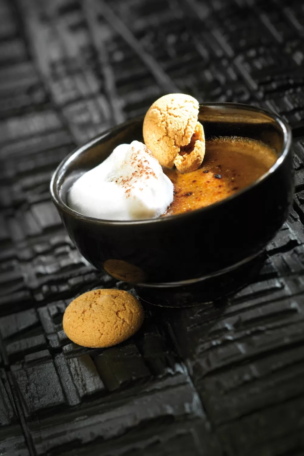 Doe de crème brûlée in kommetjes en strooi er een dun laagje suiker over. Brand de suiker met behulp van het grasbrandertje. Werk de crème brûlée af met een dot opgeklopt eiwit en serveer met de amaretti.