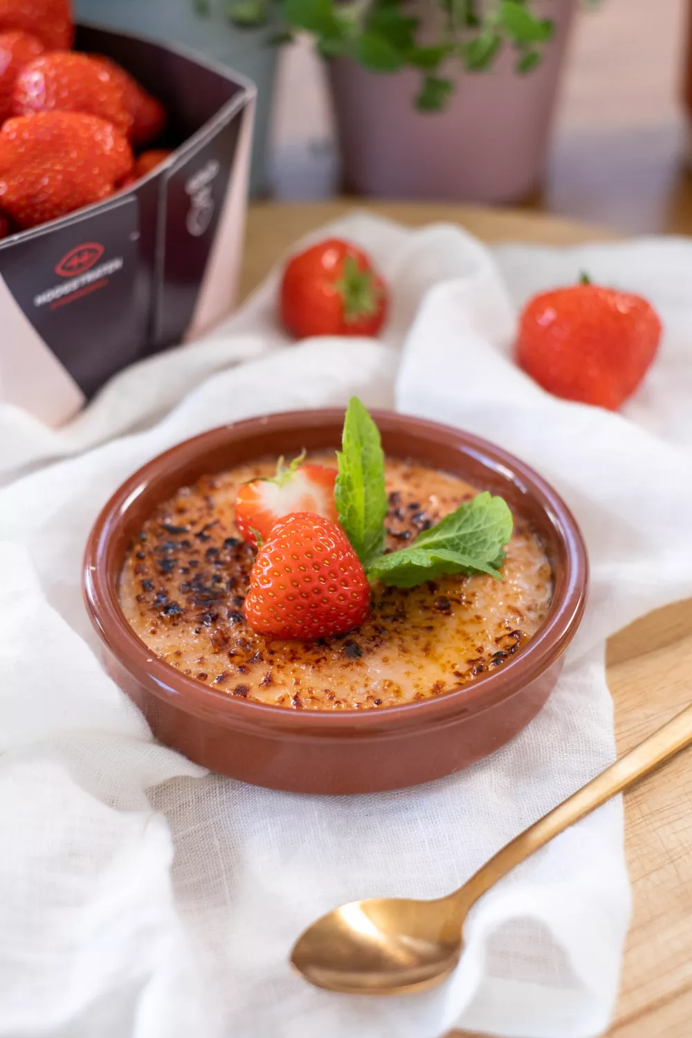 Bestrooi de crème brulées net voor het serveren met een dun laagje lichtbruine suiker en brand ze af met een keukenbrandertje zodat je een mooi, krokant suikerlaagje krijgt. Werk af met extra aardbeitjes en een takje munt.